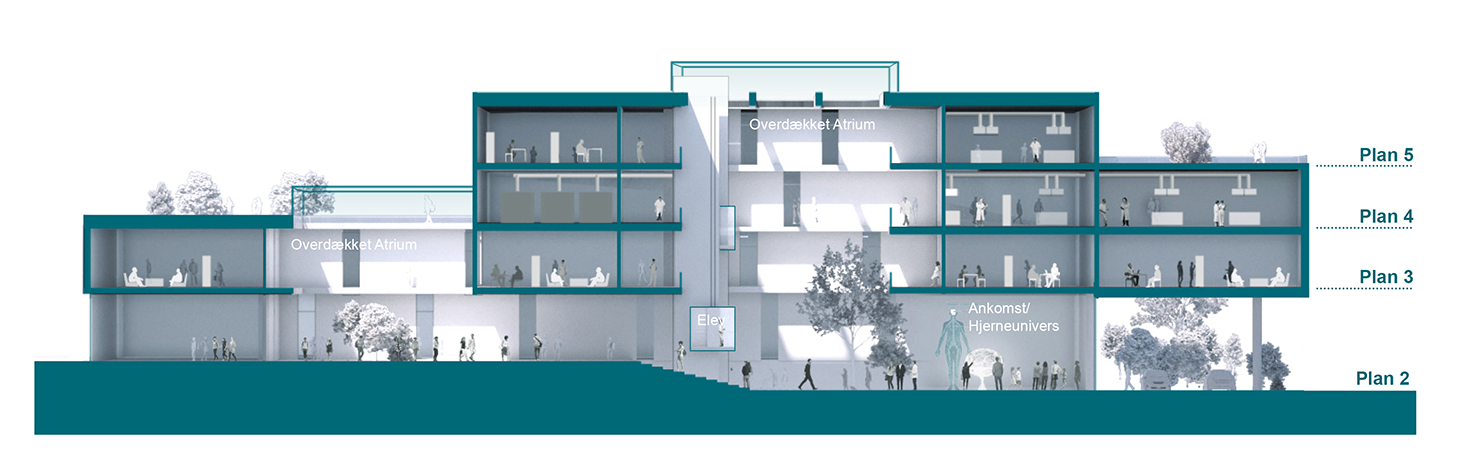 - Vil indeholde forskningsambulatorier, laboratorier, auditorium, konferencerum og kontorpladser og i grundplan et HJERNEUNIVERS, hvor offentligheden inviteres indenfor til udstillinger, foredrag og arrangementer med fokus på hjernesundhed